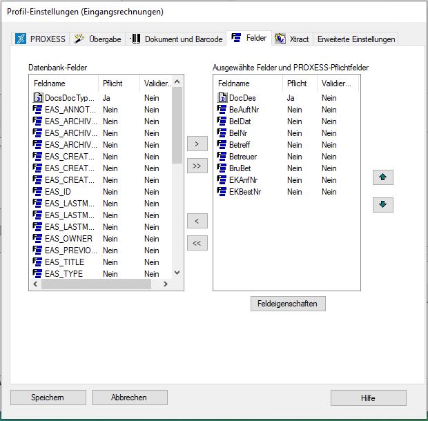 Ausgewählte Felder und PROXESS Pflichtfelder |