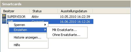 Select the “Smartcards” folder and mark the desired user in the list. In the “Action” menu (alternatively via the user’s context menu), select the function Withdraw.