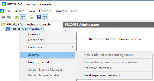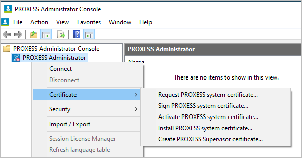 If you have installed PROXESS in the security certificate mode, a few preparatory steps must be performed in the PROXESS Administrator Console before starting the system and working with PROXESS for the first time.