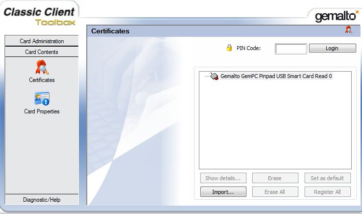 Start the program Gemalto Classic Client Toolbox via Start/Programs.