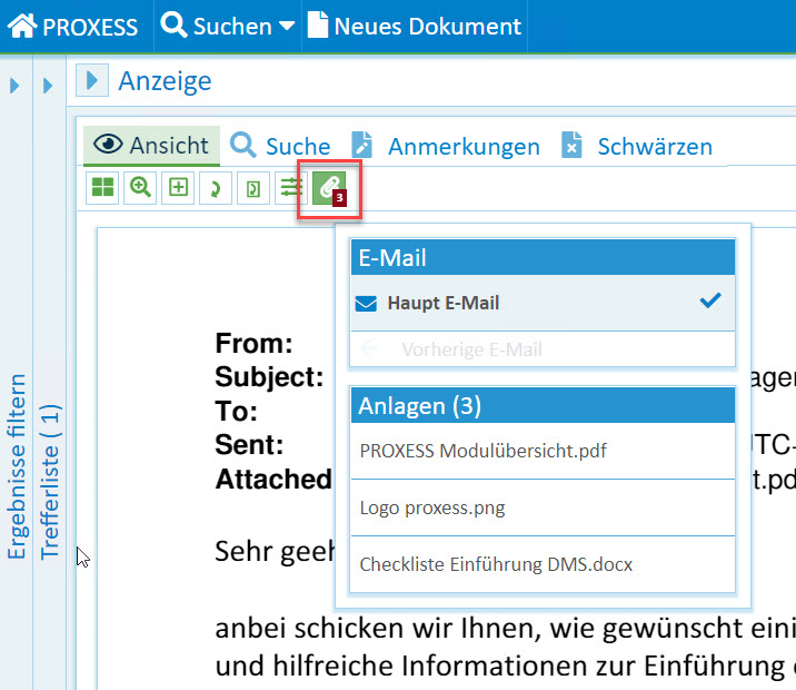 Beim Versenden der E-Mail mit PROXESS werden automatisch alle Anlagen zur Versendung vorgeschlagen und können übernommen werden (siehe Hilfethema: E-Mail-Versand)