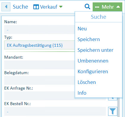Abb.: Aktuell ausgewählte Schlagwortsuche "4 Verkauf" und Menü "Suche"