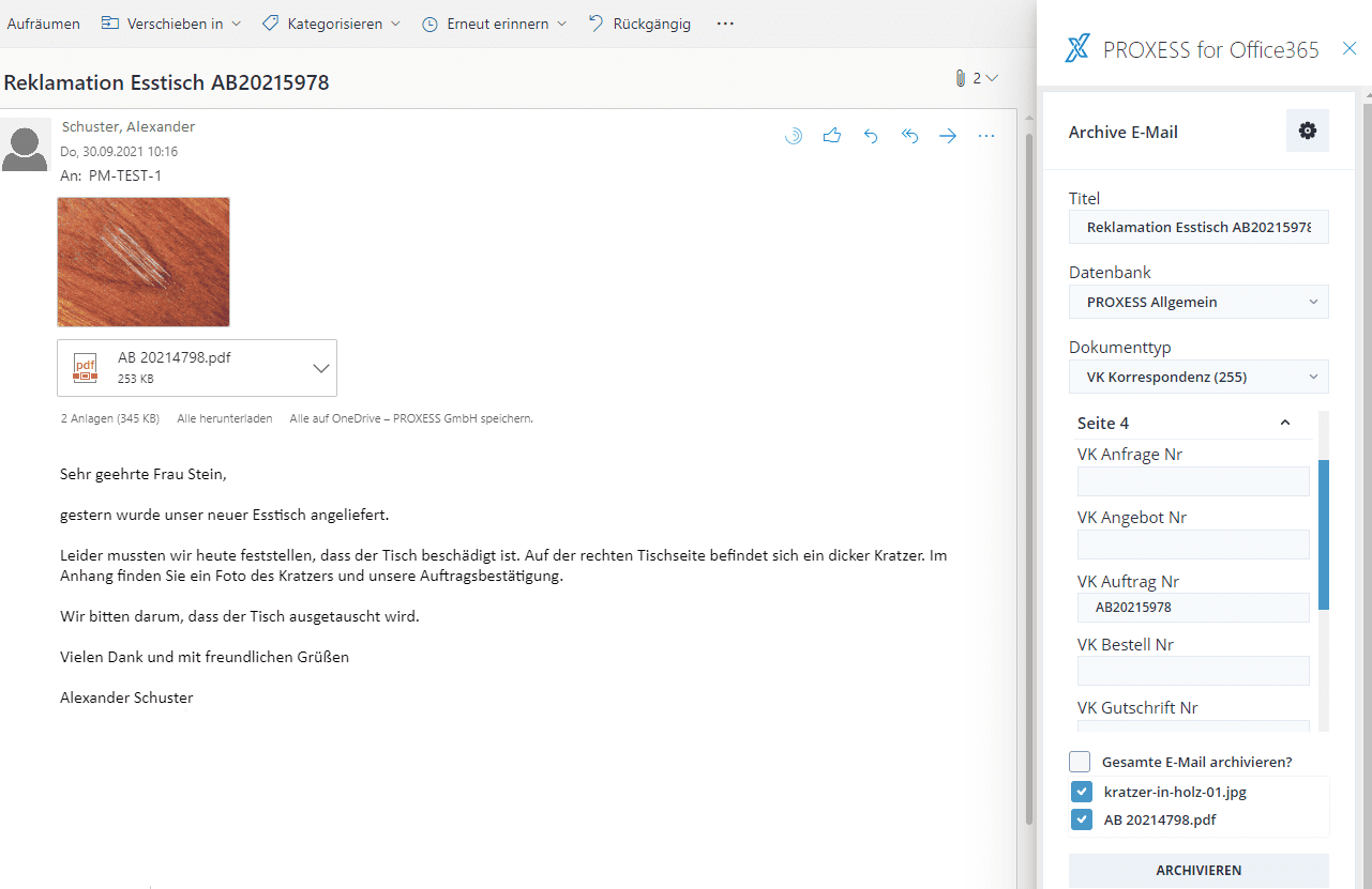 Informationen und Absprachen, die früher auf schriftlichem Wege per Post oder Fax geklärt wurde, werden heute fast nur noch über E-Mail vorgenommen. Mit unserem Modul PROXESS for Office 365 können Sie individuell E-Mails und deren Dateianhänge aus Outlook 365 im allgemeinen Unternehmensarchiv ablegen.
